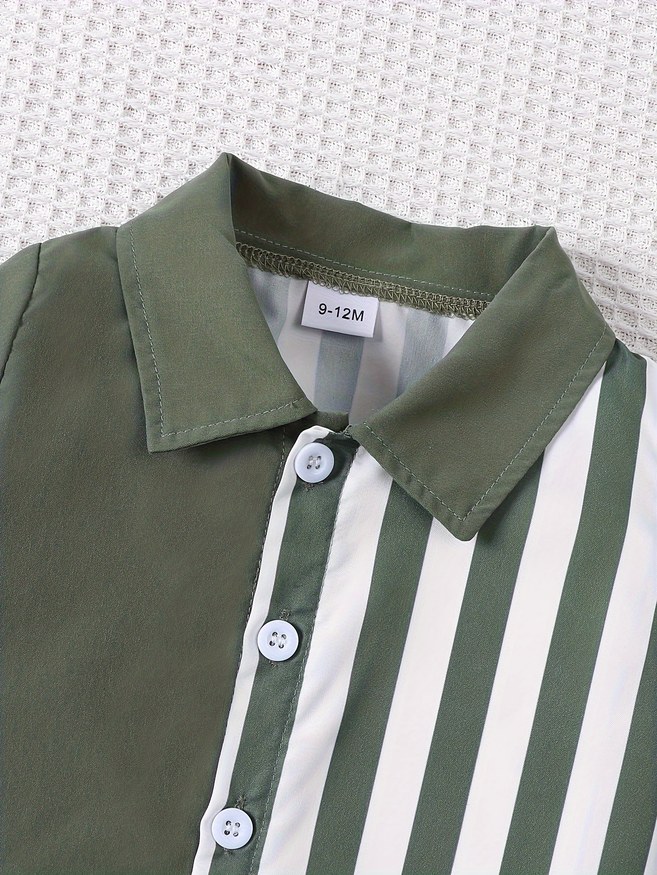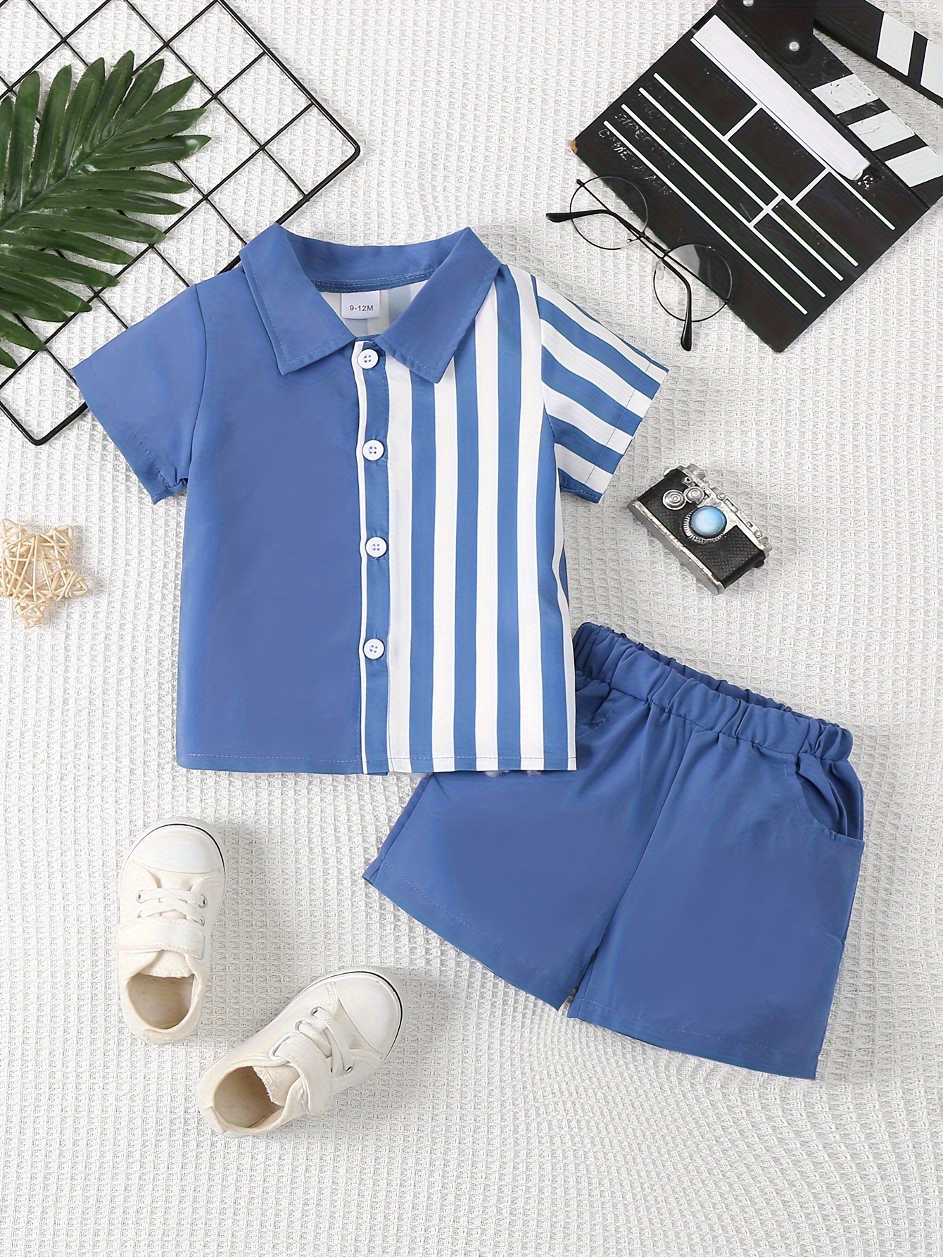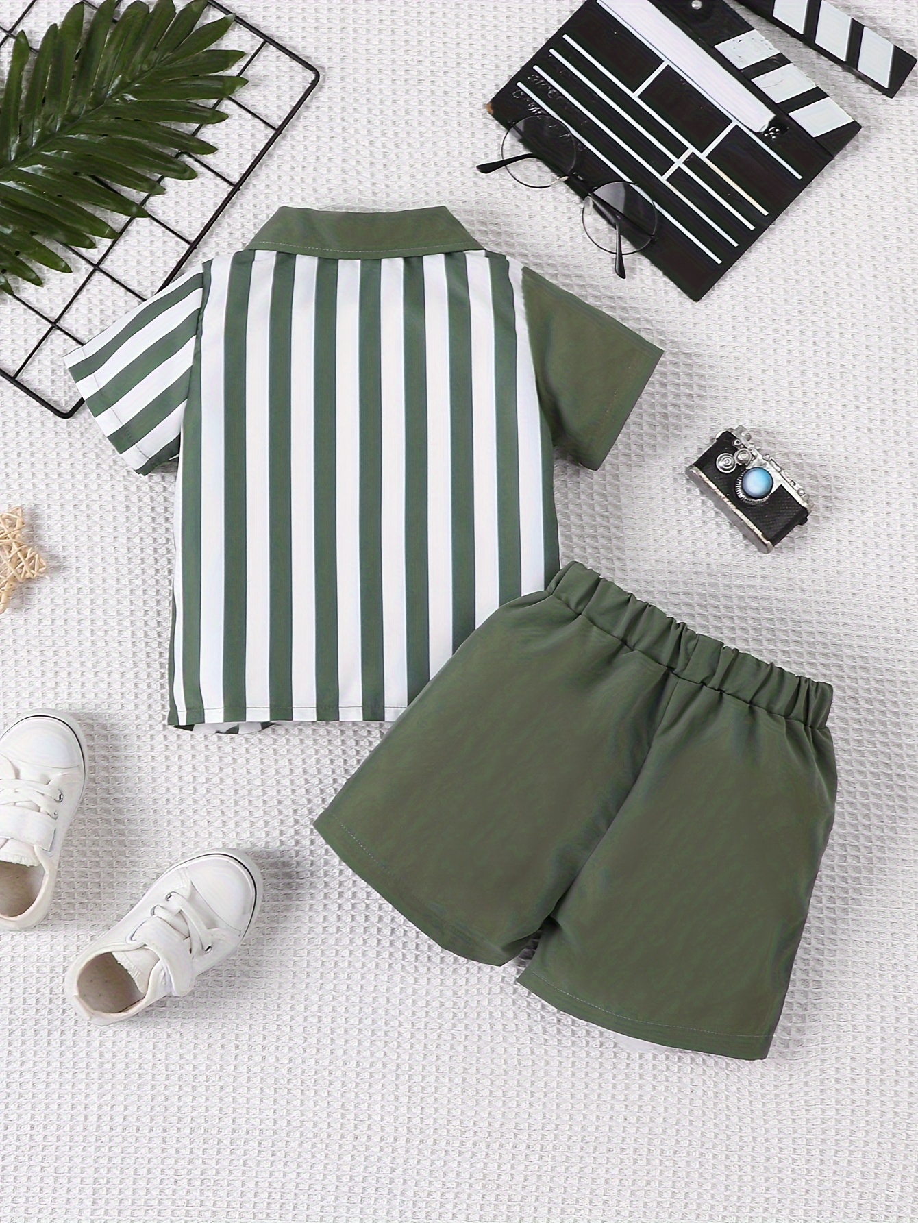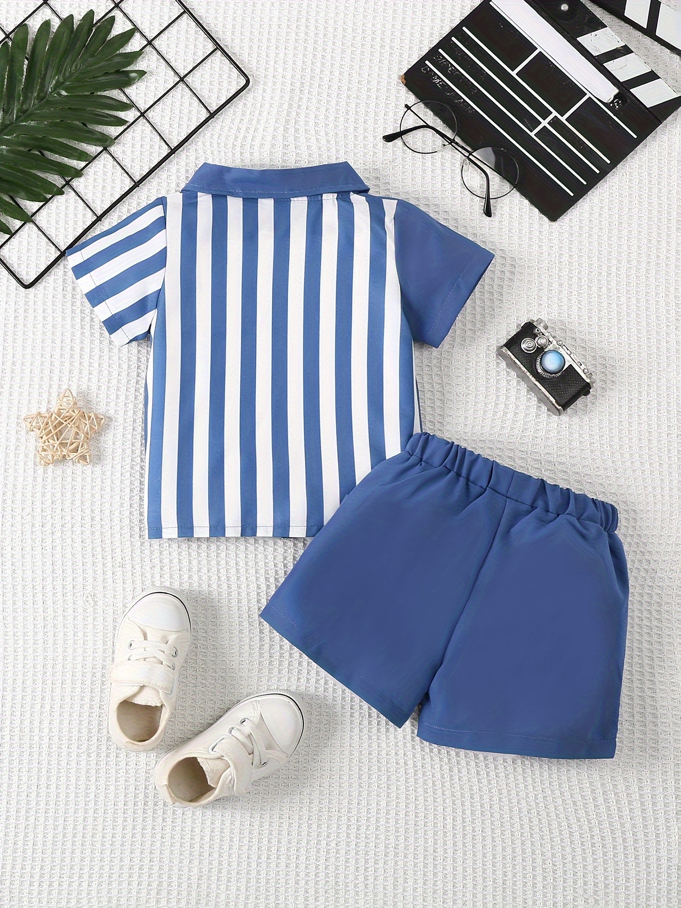 2pcs Infant & Toddler's Vertical Stripe Pattern Summer Outfit, Short Sleeve Shirt & Casual Shorts, Baby Boy's Clothes