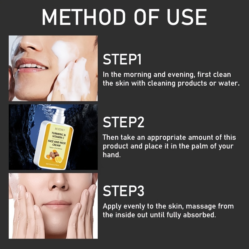 This 5.07oz Turmeric Vitamin C Neck Cream from ROZINO is designed for both face and neck care, offering deep hydration and moisture replenishment. Infused with turmeric, vitamin C, and hyaluronic acid, it helps lift and firm the skin while soothing dryness. Suitable for all skin types, this lightweight liquid formula enhances skin’s delicacy and leaves it feeling smooth, radiant, and revitalized with a natural light beige tone. Ideal for daily use, it promotes healthier, more youthful-looking skin.